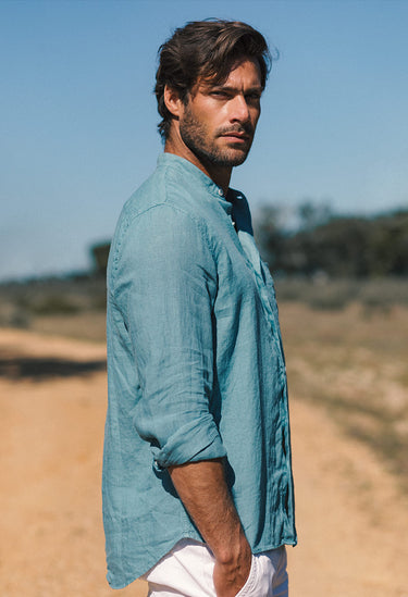 A linen shirt with a tailored silhouette and Mandarin collar for an unassuming style.