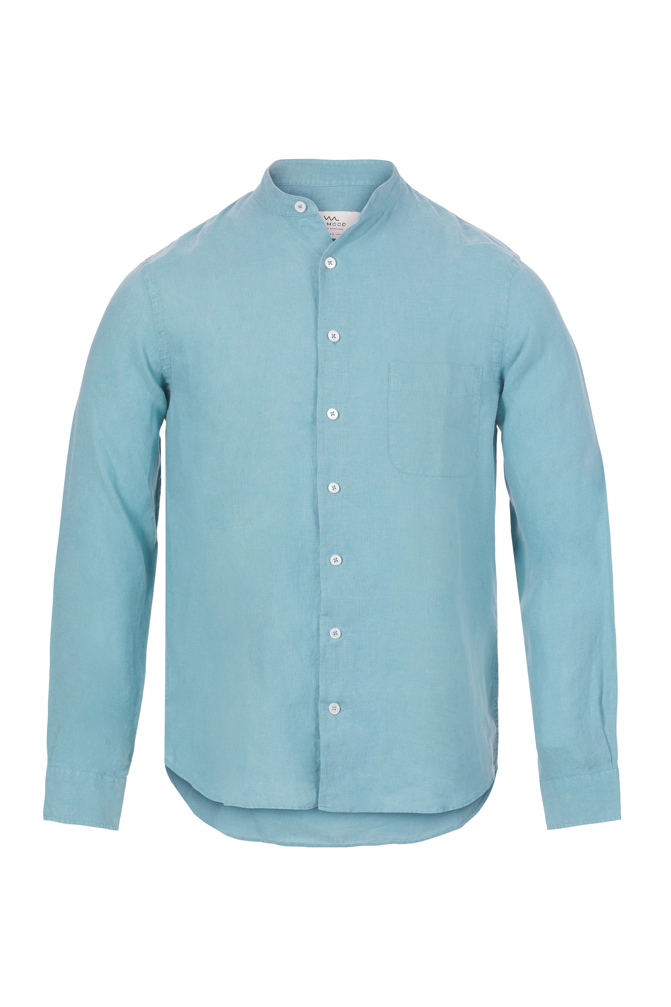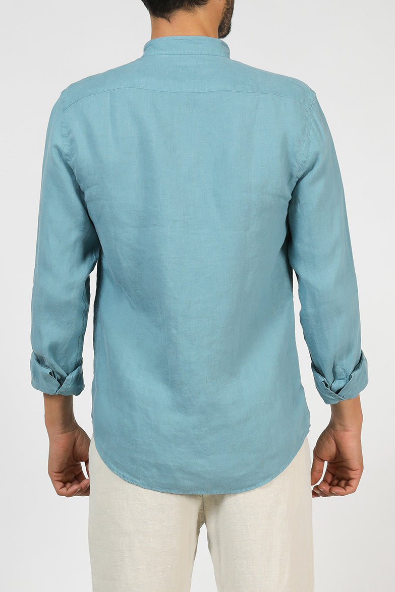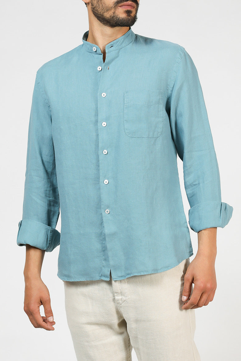 A linen shirt with a tailored silhouette and Mandarin collar for an unassuming style.