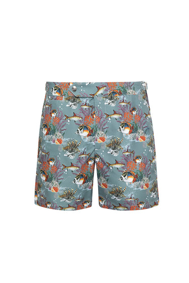 A modern redesign of the classic swim shorts silhouette in a unique print.